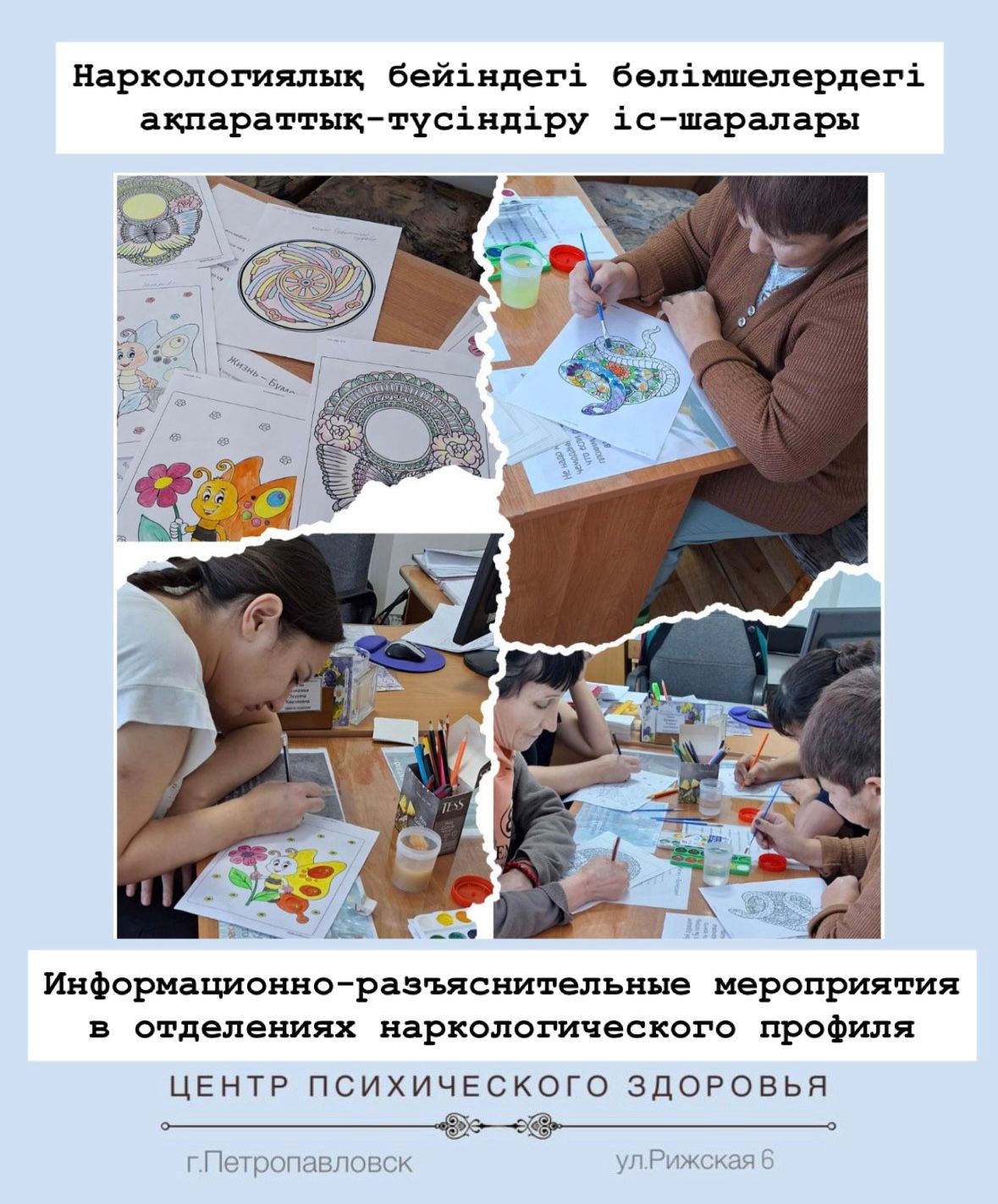 Дүниежүзілік депрессиямен күрес күні аясында (13 қаңтар) психикалық денсаулық орталығының наркологиялық бейін бөлімшесінде алкоголь мен есірткіге тәуелділік бойынша емделетін және оңалтатын пациенттерге ақпараттық-ағартушылық және қолдау іс-шаралары өткізілді.