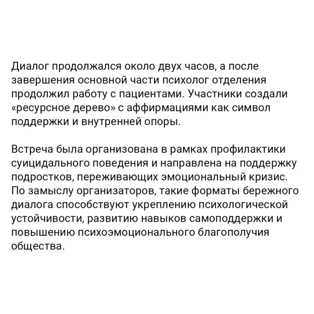 Напомним, что он проходил в рамках Декады психического здоровья «Забота о себе — забота о будущем», приуроченной ко Всемирному дню психического здоровья.